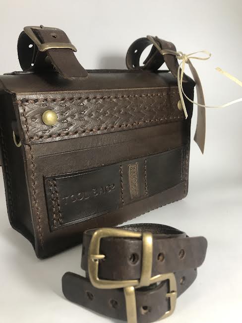 Esta TOOL BAG 0028, para guidão ou selim (observe as medidas do seu selim), é feita em soleta atanada, não forrada, aproximadamente de 2,5 mm de espessura, cujo tamanho é suficiente para levar vários apetrechos. As correias superiores giram em torno de seu eixo de fixação, e têm 11 cm de centro a centro de cada uma delas. Uma faixa de soleta traseira pode ser usada como suporte para duas correias, que acompanham o produto.